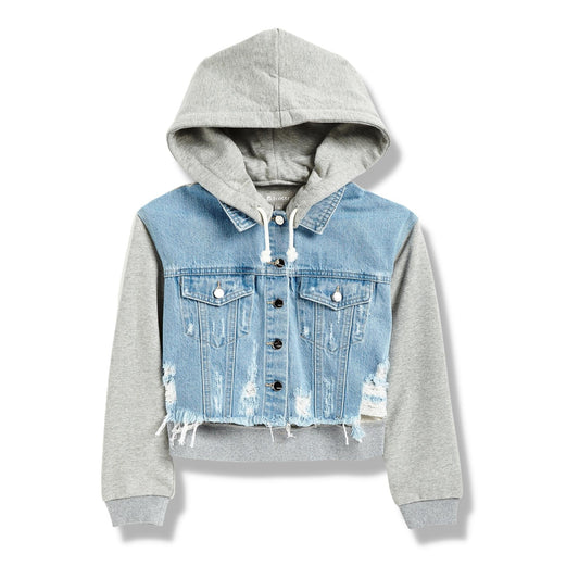 Tractr Indigo Crop Denim Jacket Combo With French Terry Sleeves